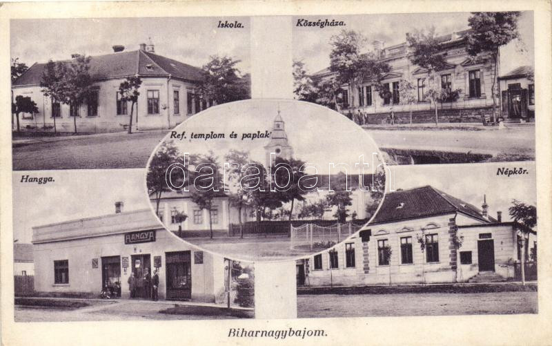 Beschreibung: Biharnagybajom, iskola, községháza, Hangya, népkör, Református templom és paplak