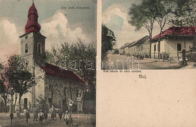 Beschreibung: Buj, Görög katolikus templom, Református iskola, utca, kiadja Hangya (b)