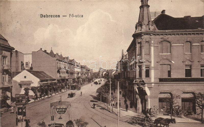 Beschreibung: Debrecen, Fő utca, Royal kioszk, György Sándor férfiruha üzlete, Kühne gépgyár, Bank egyesület, villamos