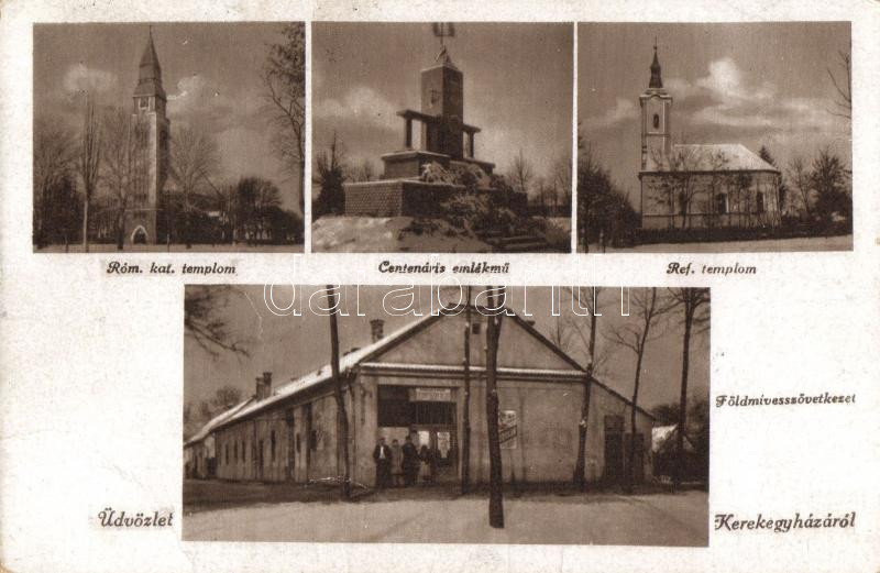 Beschreibung: Kerekegyháza, Római katolikus és református templom, Centenáris emlékmű, Földművesszövetkezet (EB)