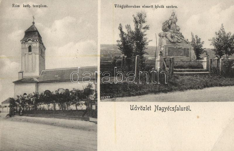 Beschreibung: Nagyécsfalu, Római katolikus templom, Világháborúban elesett hősök szobra, kiadja Schön Ferencz (EB)
