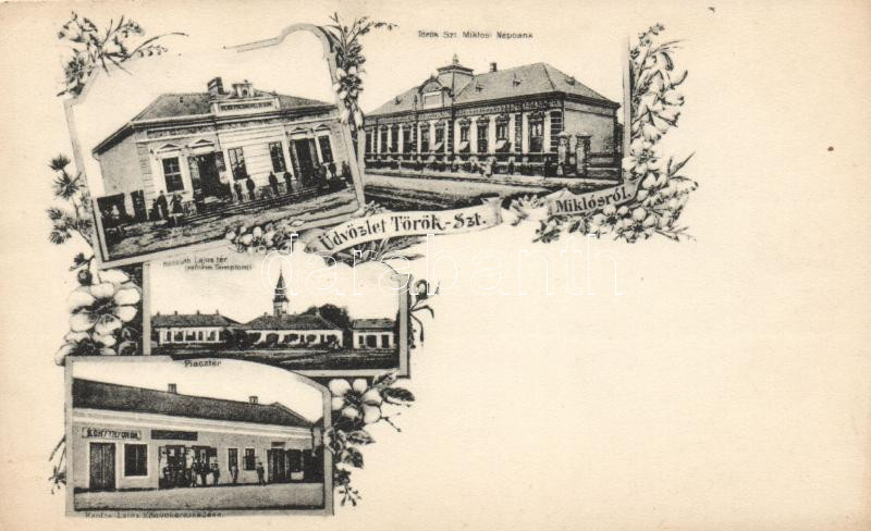 Beschreibung: Törökszentmiklós, Népbank, Piactér, Kardos Lajos Könyvkereskedése, Könyvnyomda, Kossuth Lajos tér, floral, Kardos Lajos kiadása