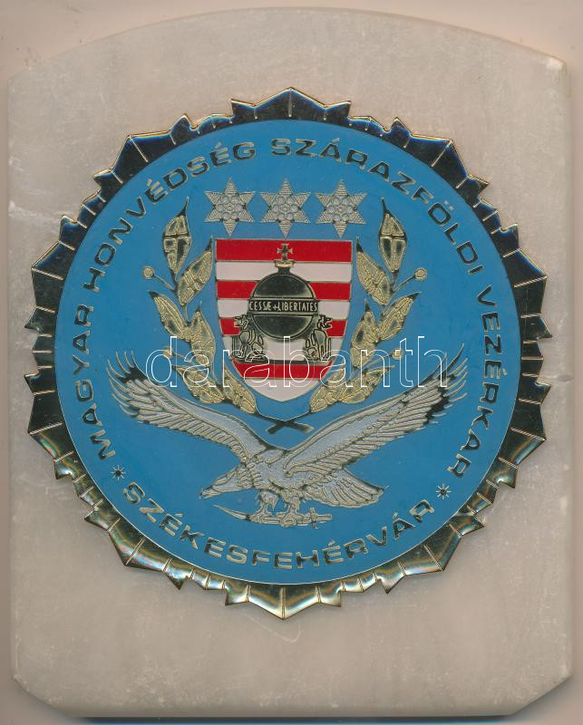 Beschreibung: DN "Magyar Honvédség Szárazföldi Vezérkara - Székesfehérvár" aranyozott emlékplakett márványlapon, dísztokban T:1-