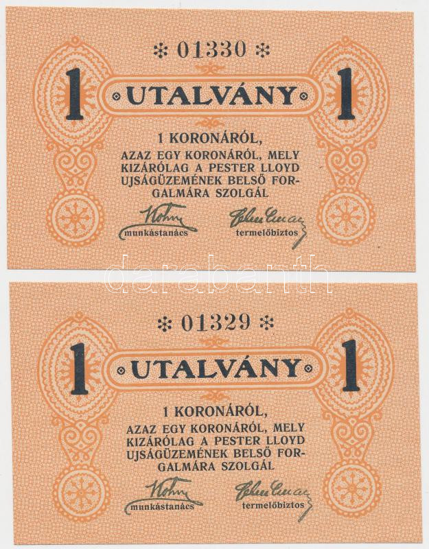 Beschreibung: ~1920. "Pester Lloyd" utalvány 1K (2x) sorszámkövetők T:I
