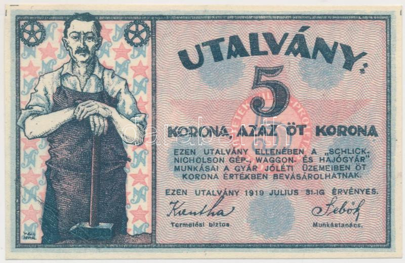 Budapest 1919. "Schlick Nicholson Gép-Waggon- és Hajógyár" 5K utalvány... https://www.darabanth.com/de/210-Fernauktion/210.0/Numismatik/Notgelden~98/Budapest-1919-Schlick-Nicholson-Gep-Waggon-es-Hajogyar-5K-utalvany-TI~II865033