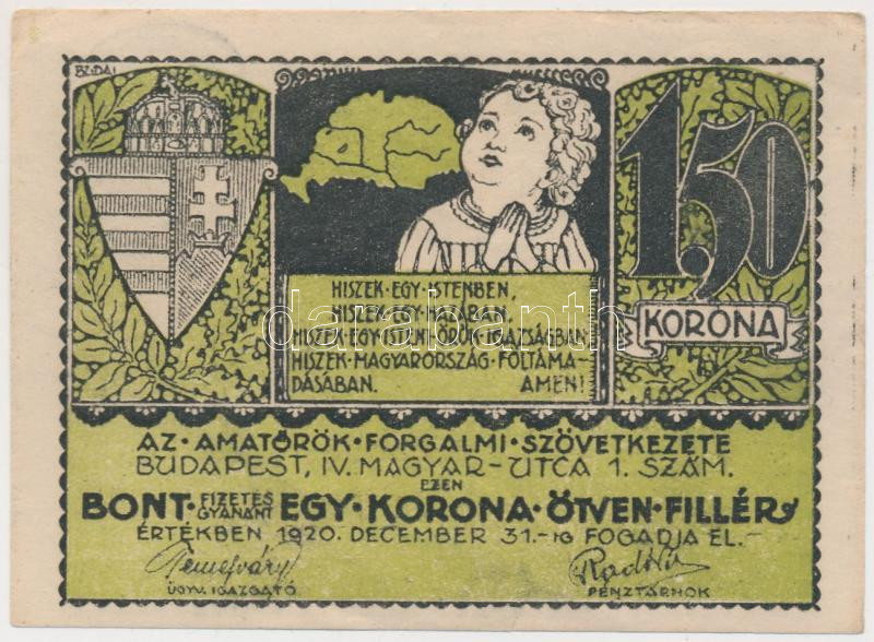 Budapest 1920.12.31. "Amatőrök Forgalmi Szövetkezete" 1,5K ovális bély... https://www.darabanth.com/de/210-Fernauktion/210.0/Numismatik/Notgelden~98/Budapest-19201231-Amatorok-Forgalmi-Szovetkezete-1-5K-ovalis-belyegzo-a-hatlapon-TII~II865039