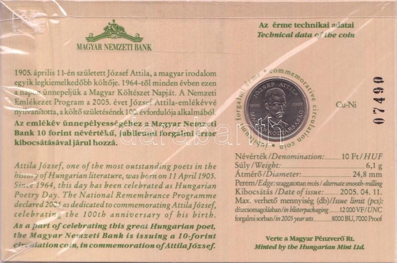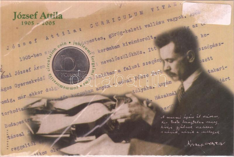 2005. 10Ft "József Attila" sorszámozott emléklapon T:1 https://www.darabanth.com/de/210-Fernauktion/210.0/Numismatik/Ungarische-Munzen~100/2005-10Ft-Jozsef-Attila-sorszamozott-emleklapon-T1~II864394