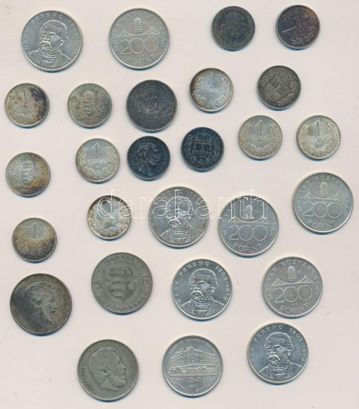 Beschreibung: Vegyes ezüst tétel 200Ft Ag (9x) + 5ft Ag (3x) + 1P Ag (10x) + 1K (4x) + 2P Ag T:vegyes
