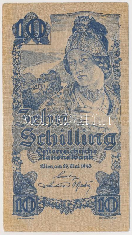 Austria 1945. 10 Schilling first ... https://www.darabanth.com/de/210-Fernauktion/210.0/Numismatik/Weltweit-Banknoten~103/Ausztria-1945-10Sch-1kiadas-TIII--3Cbr3EAustria-1945-10-Schilling-first-issue-CF~II865049