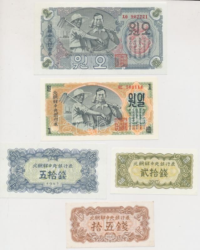 North Korea 1947. 15 C... https://www.darabanth.com/de/210-Fernauktion/210.0/Numismatik/Weltweit-Banknoten~103/Eszak-Korea-1947-15C-plus-20C-plus-50C-plus-1W-plus-5W-CI-3Cbr3ENorth-Korea-1947-15-Chon-plus-20-Chon-plus-50-Chon-~II865965