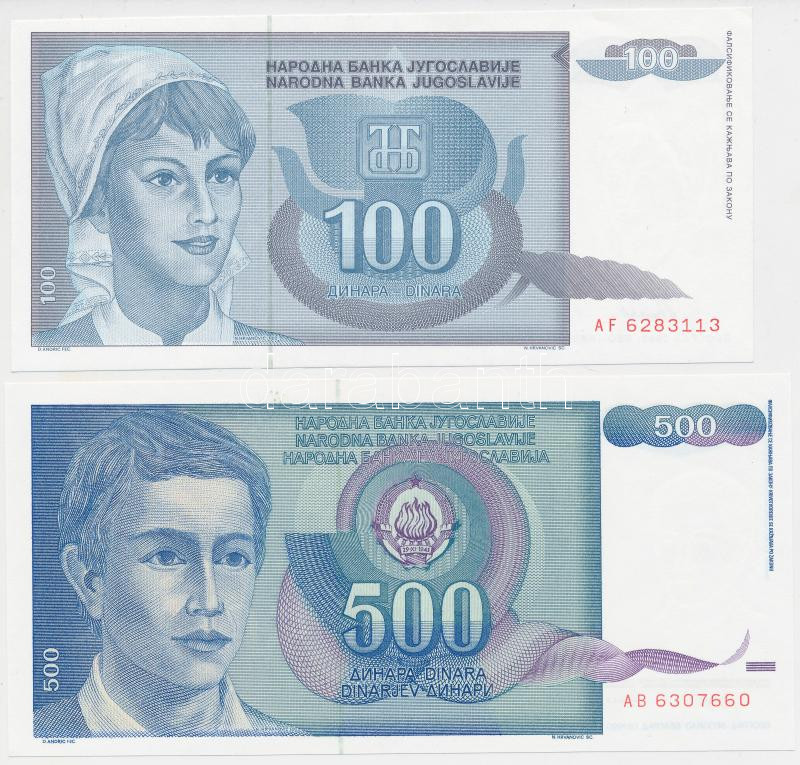 Yugoslavia 1990-1992. 100 Dina... https://www.darabanth.com/de/210-Fernauktion/210.0/Numismatik/Weltweit-Banknoten~103/Jugoszlavia-1990-1992-100D-plus-500D-TI--3Cbr3EYugoslavia-1990-1992-100-Dinara-plus-500-Dinara-CAU~II867245