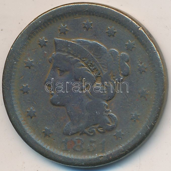 Kr... https://www.darabanth.com/de/210-Fernauktion/210.0/Numismatik/Weltweit-Munzen~104/Amerikai-Egyesult-Allamok-1851-1c-Cu-T2--3Cbr3EUSA-1851-1-Cent-Cu-CVF-3Cbr3EKrause-KM23-67~II866373
