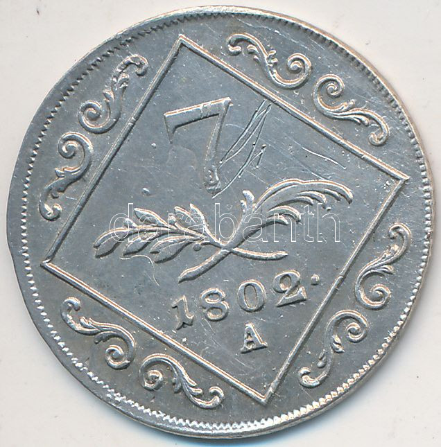 Austria 1802A 7 Kreuzer A... https://www.darabanth.com/de/210-Fernauktion/210.0/Numismatik/Weltweit-Munzen~104/Ausztria-1802A-7Kr-Ag-I-Ferenc-T2-karcos-3Cbr3EAustria-1802A-7-Kreuzer-Ag-Franz-I-CXF-scratche~II867345
