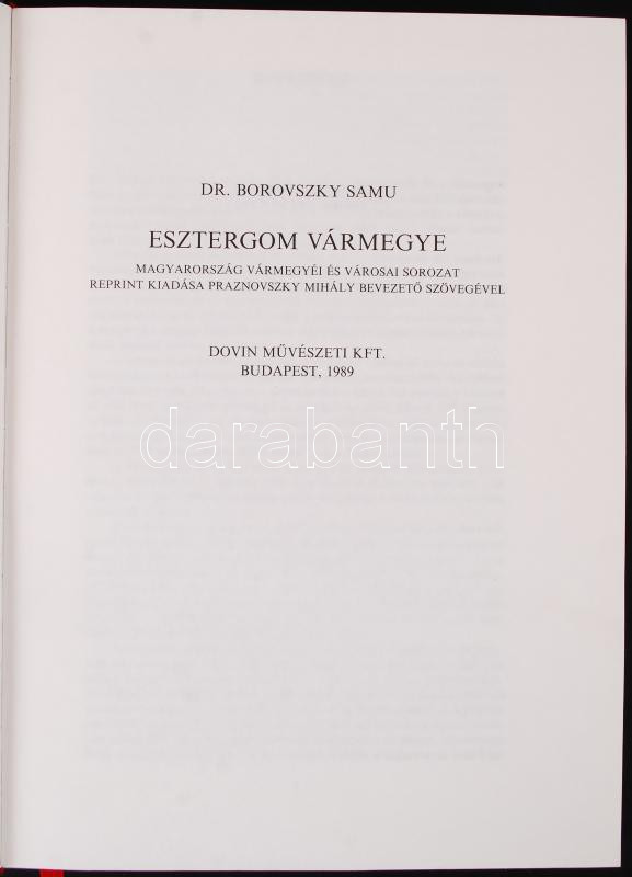 Dr. Borovszky Samu: Esztergom vármegye, Magyarország vármegyéi és városai sorozat reprint kiadása Praznovszky Mihály bevezető szövegével. Bp., 1989, Dovin Művészeti Kft. Kiadói aranyozott egészvászon kötés, védőborítóval, jó állapotban.