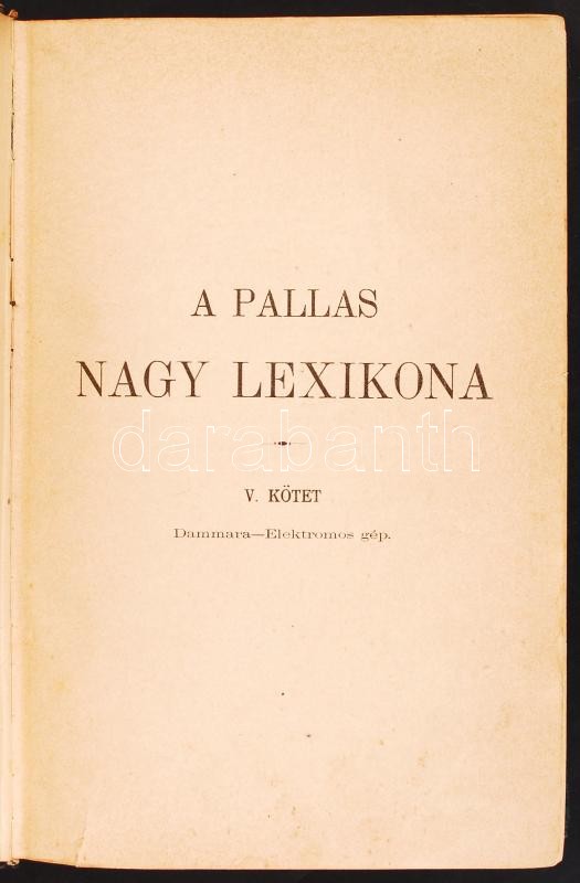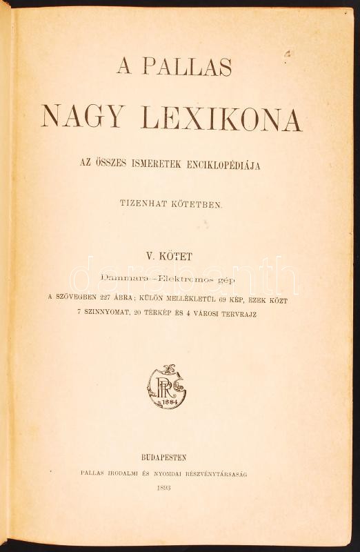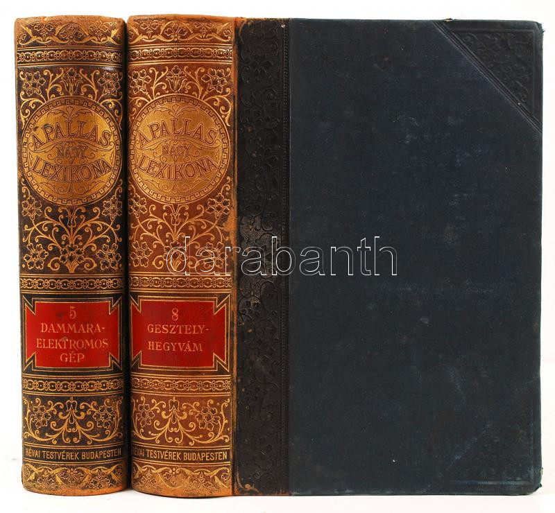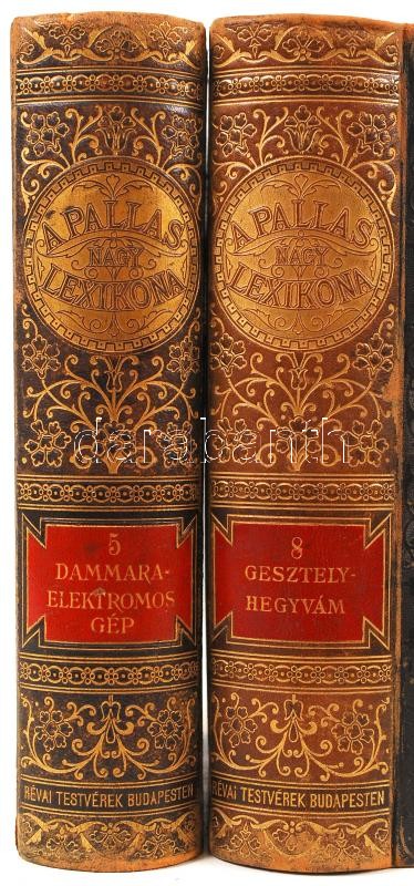 A Pallas Nagy Lexikona Az összes ismeretek enciklopédiája. 5 és 8. kötet. Bp., 1893–1894. Pallas. Szövegközti képekkel, térképekkel, chromolitográfiákkal gazdagon illusztrálva. Aranyozott gerincű, kiadói félbőr kötésben, festett lapszélek, kopottas állapotban