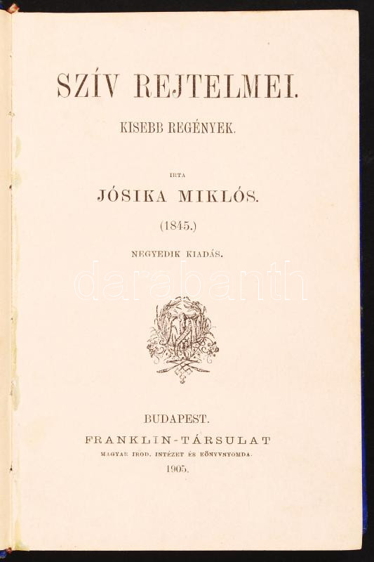 Jósika Miklós: Szív rejtelmei. Kisebb regények. Negyedik kiadás. Bp., ... https://www.darabanth.com/de/211-Fernauktion/211.0/Andere-Sammelgebiete/Bucher-Sonstige-Raritaten~400344/Josika-Miklos-Sziv-rejtelmei-Kisebb-regenyek-Negyedik-kiadas-Bp-1905-Franklin-Egeszva~II870891