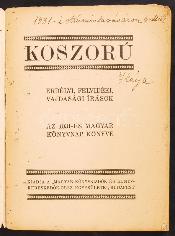 Koszorú, Erdélyi, felvidéki, vajdasági írások. Az 1931-es magyar könyv... https://www.darabanth.com/de/211-Fernauktion/211.0/Andere-Sammelgebiete/Bucher-Sonstige-Raritaten~400344/Koszoru-Erdelyi-felvideki-vajdasagi-irasok-Az-1931-es-magyar-konyvnap-konyve-Bp-1931-~II871769