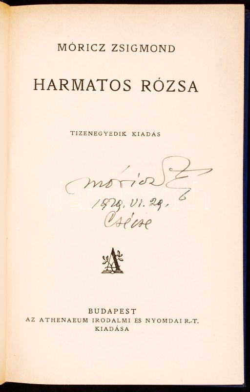 Móricz Zsigmond: Harmatos rózsa. Aláírt példány! Bp., Athenaeum. Jó ál... https://www.darabanth.com/de/211-Fernauktion/211.0/Andere-Sammelgebiete/Bucher-Sonstige-Raritaten~400344/Moricz-Zsigmond-Harmatos-rozsa-Alairt-peldany-Bp-Athenaeum-Jo-allapotu-egeszvaszon-~II867645