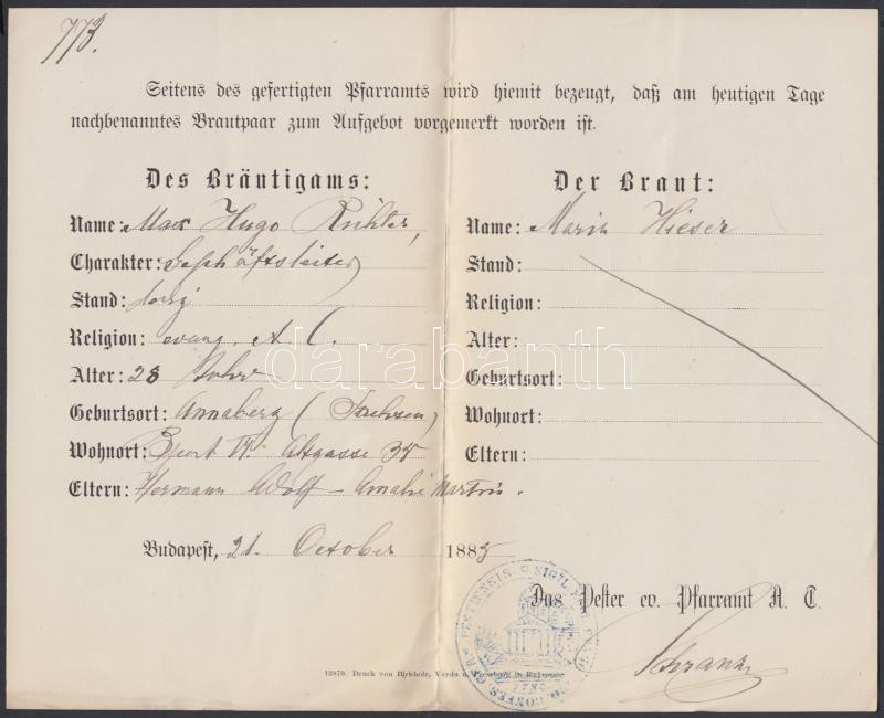 1883 Bp., Német nyelvű házasság kihirdetését előjegyző igazolás https://www.darabanth.com/de/211-Fernauktion/211.0/Andere-Sammelgebiete/Dokument~400319/1883-Bp-Nemet-nyelvu-hazassag-kihirdeteset-elojegyzo-igazolas~II874144