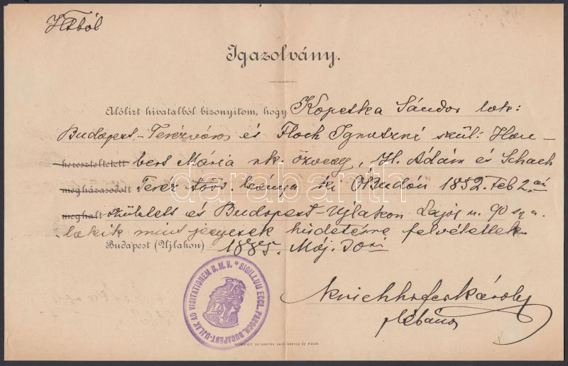 1885 Bp., Igazolás jegyesekként való egyházközségi bejegyzésről https://www.darabanth.com/de/211-Fernauktion/211.0/Andere-Sammelgebiete/Dokument~400319/1885-Bp-Igazolas-jegyesekkent-valo-egyhazkozsegi-bejegyzesrol~II874191