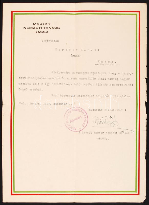 1938 Magyar Nemzeti Tanács Kassa által kiállított oklevél tanúsítandó ... https://www.darabanth.com/de/211-Fernauktion/211.0/Andere-Sammelgebiete/Dokument~400319/1938-Magyar-Nemzeti-Tanacs-Kassa-altal-kiallitott-oklevel-tanusitando-a-kerelmezo-magyar-C3~II869461