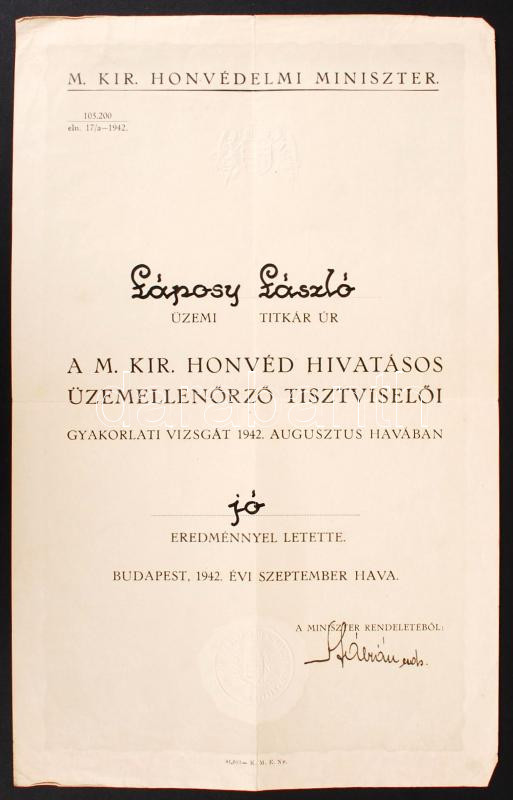 Beschreibung: 1942 Bp., M. Kir. Honvéd hivatásos üzemellenőrző tisztviselői gyakorlati vizsgáról szóló oklevél szárazpecséttel