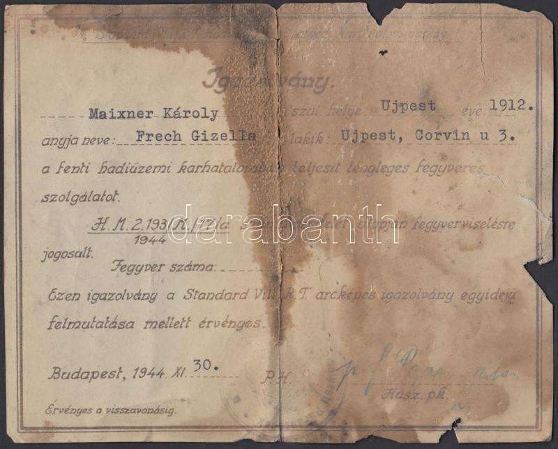 1945 Kétnyelvű, fegyverviselésre jogosító igazolvány, sérült állapotba... https://www.darabanth.com/de/211-Fernauktion/211.0/Andere-Sammelgebiete/Dokument~400319/1945-Ketnyelvu-fegyverviselesre-jogosito-igazolvany-serult-allapotban~II872481