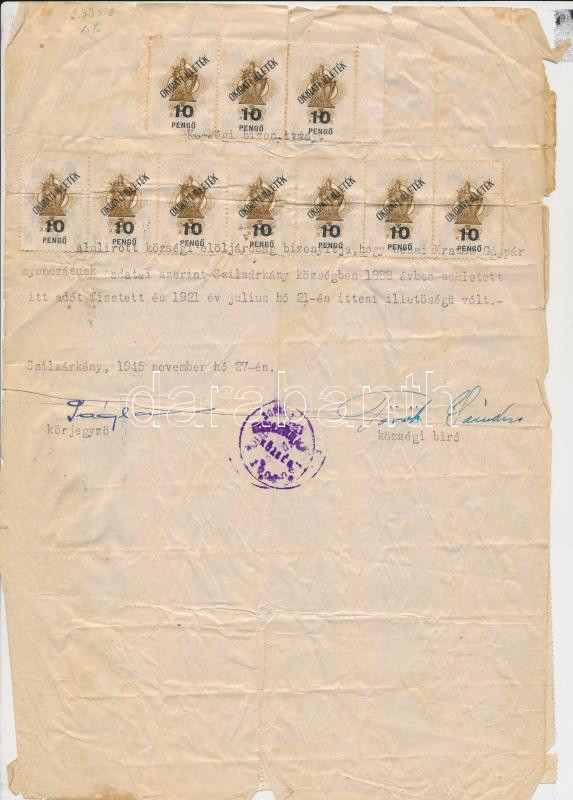 1945 Szilsárkányi illetőségi bizonyítvány 50 db 10 pengős és 10 db pen... https://www.darabanth.com/de/211-Fernauktion/211.0/Andere-Sammelgebiete/Dokument~400319/1945-Szilsarkanyi-illetosegi-bizonyitvany-50-db-10-pengos-es-10-db-pengos-okirati-illetekb~II859601