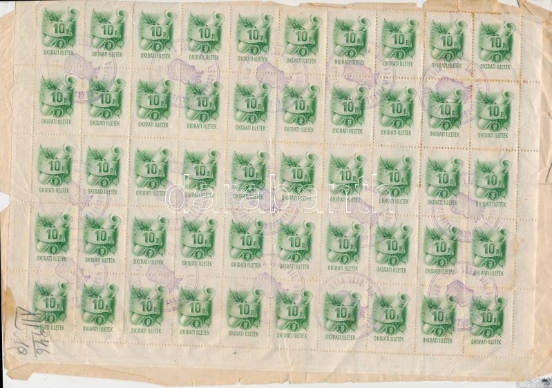Beschreibung: 1945 Szilsárkányi illetőségi bizonyítvány 50 db 10 pengős és 10 db pengős okirati illetékbélyeggel
