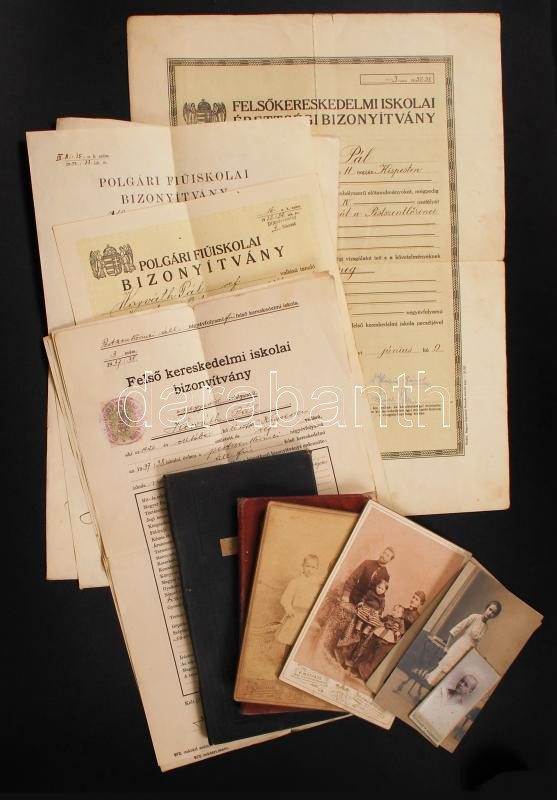 cca 1931-1941 Vegyes okmány tétel (Oberleutensdorf betétkönyve, érettségi bizonyítvány, iskolai bizonyítvány, polgári iskolai bizonyítvány, keményhátú családi fotók, leckekönyv)