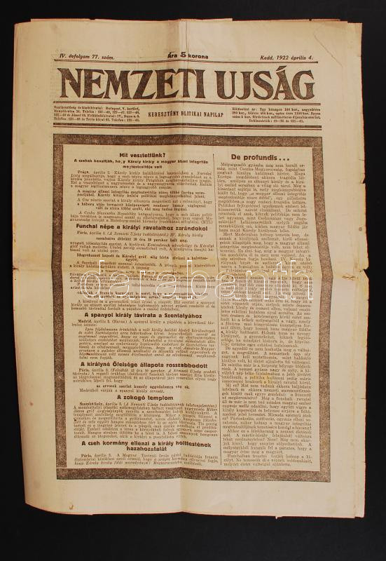1922 A Nemzeti Újság IV. Károly haláláról tudósító száma https://www.darabanth.com/de/211-Fernauktion/211.0/Andere-Sammelgebiete/Drucksachen~400330/1922-A-Nemzeti-Ujsag-IV-Karoly-halalarol-tudosito-szama~II874393