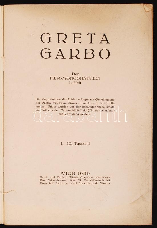 Beschreibung: 1930 Bécs, Greta Garbo, Der Film-MOnographien, 1. Heft, a füzetben a színésznő 28 db egész oldalas fotójával