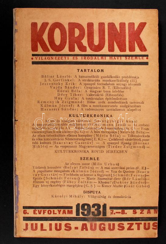 Beschreibung: 1931 A Korunk c. folyóirat 6-7. száma, benne Károlyi Mihály vita, Déry Tibor novellájának 1. közlésével
