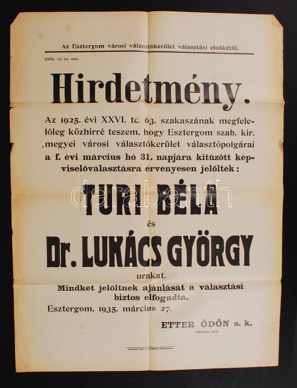 Beschreibung: 1935 Nagyméretű hirdetmény az Esztergomban sorra kerülő képviselőválasztásról