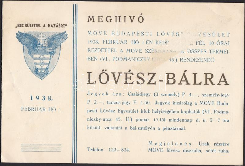 1938 Meghívó a MOVE Budapesti Lövészegyesület báljára, felületén sérül... https://www.darabanth.com/de/211-Fernauktion/211.0/Andere-Sammelgebiete/Drucksachen~400330/1938-Meghivo-a-MOVE-Budapesti-Loveszegyesulet-baljara-feluleten-serules~II869646
