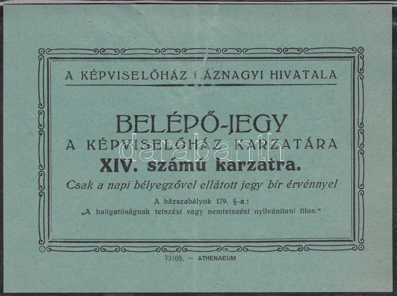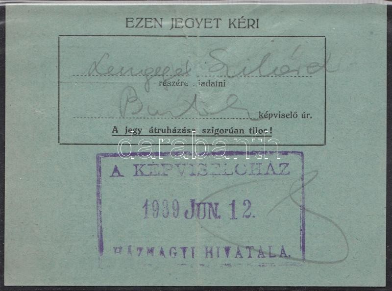 1939 A Képviselőház Háznagyi Hivatala által kiállított belépőjegy a hi... https://www.darabanth.com/de/211-Fernauktion/211.0/Andere-Sammelgebiete/Drucksachen~400330/1939-A-Kepviselohaz-Haznagyi-Hivatala-altal-kiallitott-belepojegy-a-hivatal-pecsetjevel~II869369