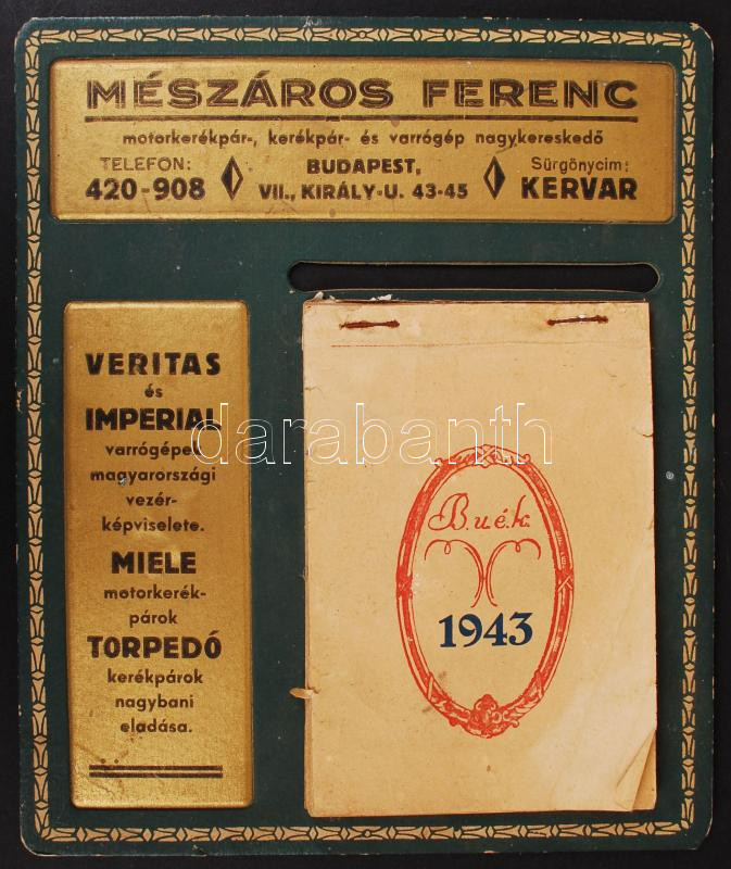 Beschreibung: 1943 Bp., Mészáros Ferenc motorkerékpár-, kerékpár- és varrógép nagykereskedő reklámos asztali naptára