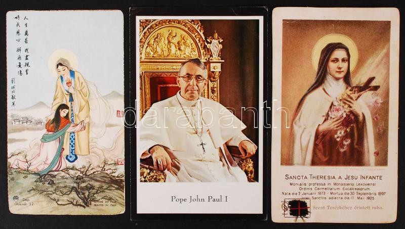3 db egyedi szentkép (I. János Pál pápasága idején kiadott szentkép, a magyar ferencesek háborúban elpusztult paokingi missziójáért, Szent Terézkéhez érintett ruhadarabka)