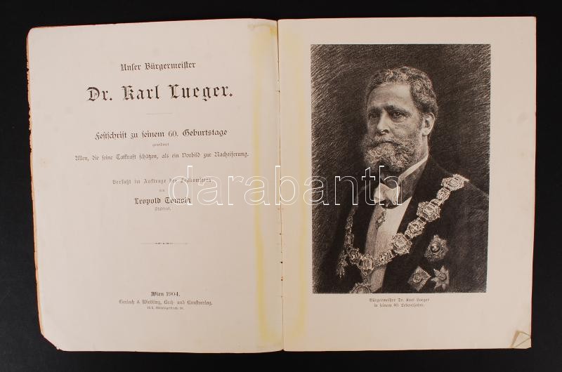 Beschreibung: Leopold Tomola: Unser Bürgermeister Dr. Karl Lueger zu seinem 60. Geburtstage. Wien, Gerlach Wiedling, 1904. Borító elvált / Cover comes off