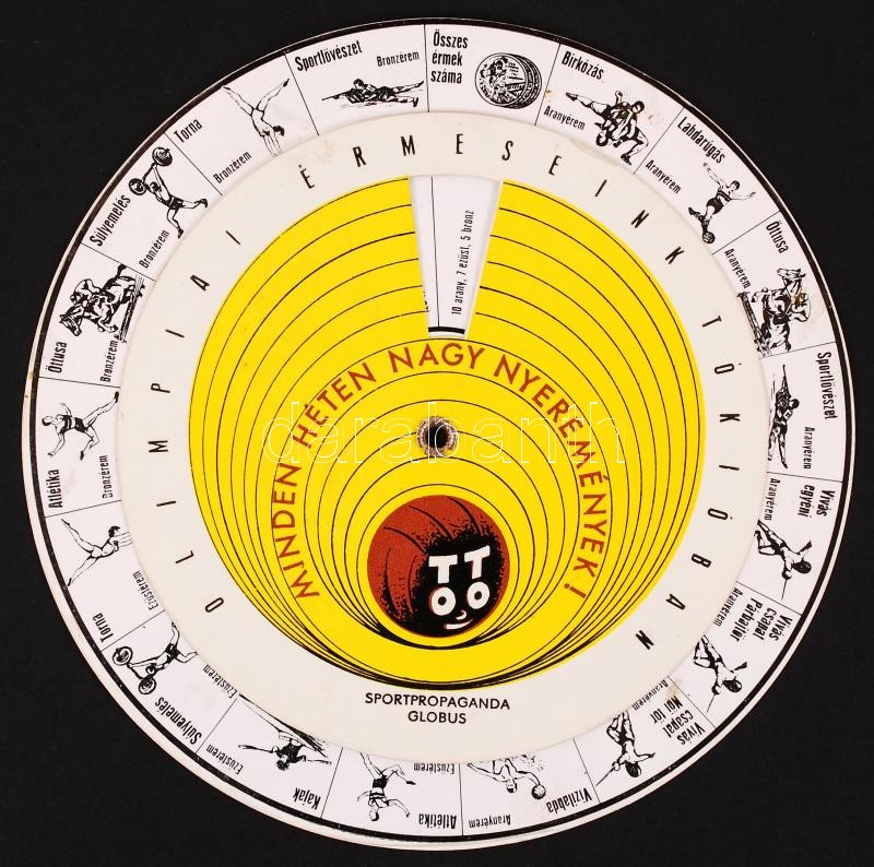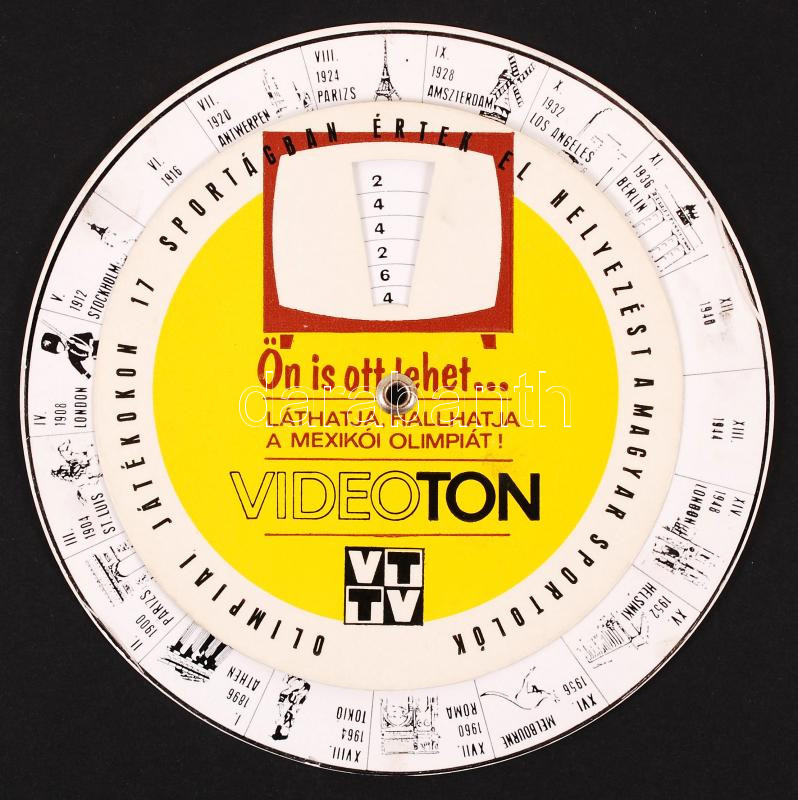 1964 Tokiói olimpiára kiadott érdekes mechanikus érem-mutató forgónaptár az összes olimpiával és részletesen a Tokiói Olimpia érmeivel. Videoton reklám / Olympics mechanic medal calendar.