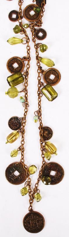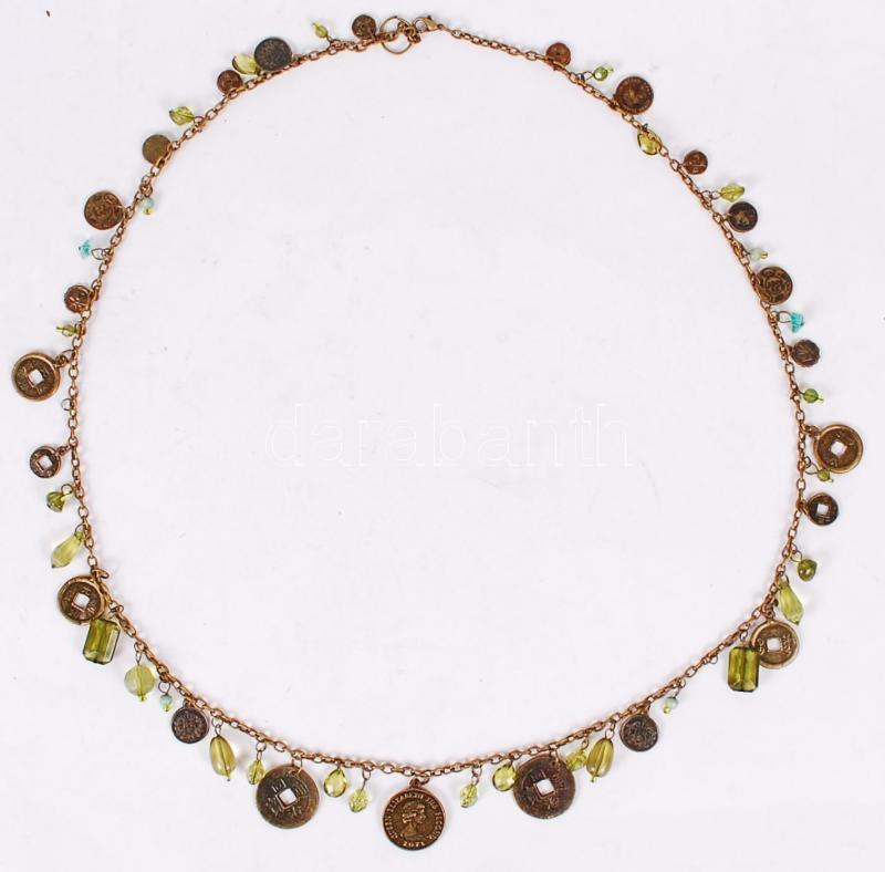 Beschreibung: Divatos zöld gyöngyökkel és érmékkel díszített bizsu nyaklánc, h: 88 cm