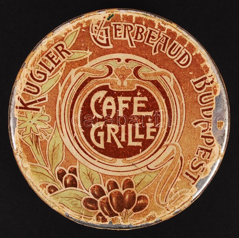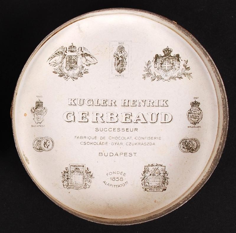 Beschreibung: cca 1900 Kugler Henrik Gerbaud Cs. és Kir. Udvari Cukrászda és Csokoládé-Gyár fém dobozkája, d: 8 cm, m: 3 cm