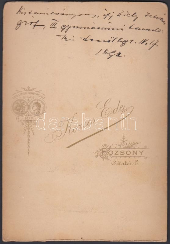 1892 gróf Zichy Istvánt (1879-1951) ábrázoló keményhátú fotó, hátoldal... https://www.darabanth.com/de/211-Fernauktion/211.0/Andere-Sammelgebiete/Foto~400322/1892-grof-Zichy-Istvant-1879-1951-abrazolo-kemenyhatu-foto-hatoldalon-feliratozva-11x1~II875070