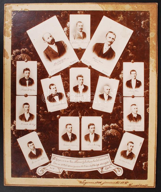 1896 Fogarasi m. kir. állami felsőkereskedelmi iskolán az 1895/6 tanév június 12-13-án érettségi vizsgát tett ifjak tablóképe, 14 nevesített kisportréval, 32x26 cm