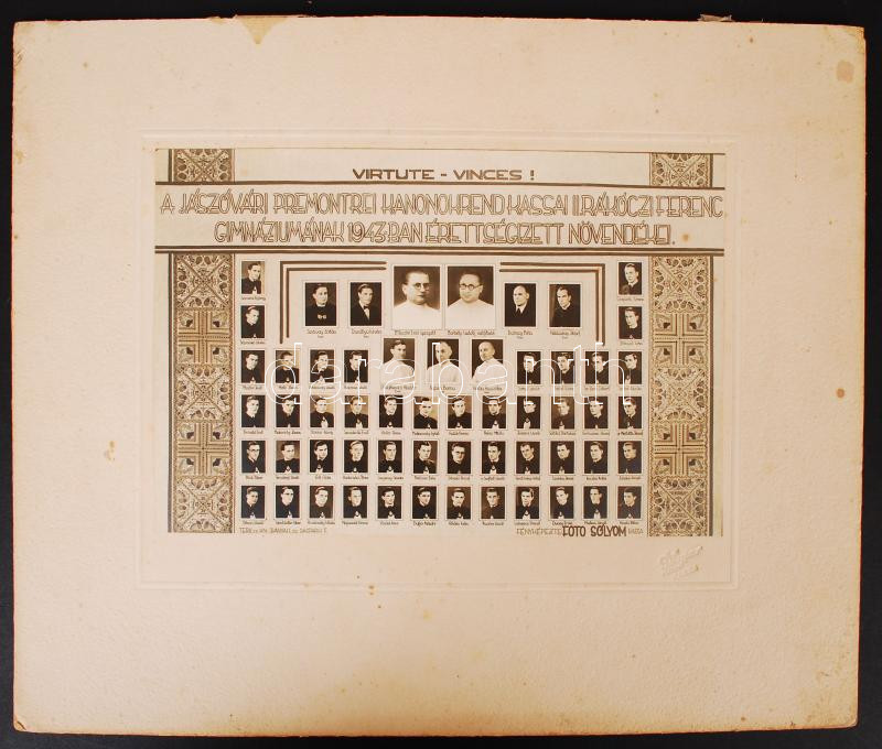 1943 Sólyom fotó (Kassa): A Jászóvári Premontrei Kanonokrend Kassai II. Rákóczi Ferenc gimnáziumának 1943-ban érettségizett növendékei, feliratozott kistabló 57 nevesített portréval, képméret 16x23 cm, karton 29x35 cm