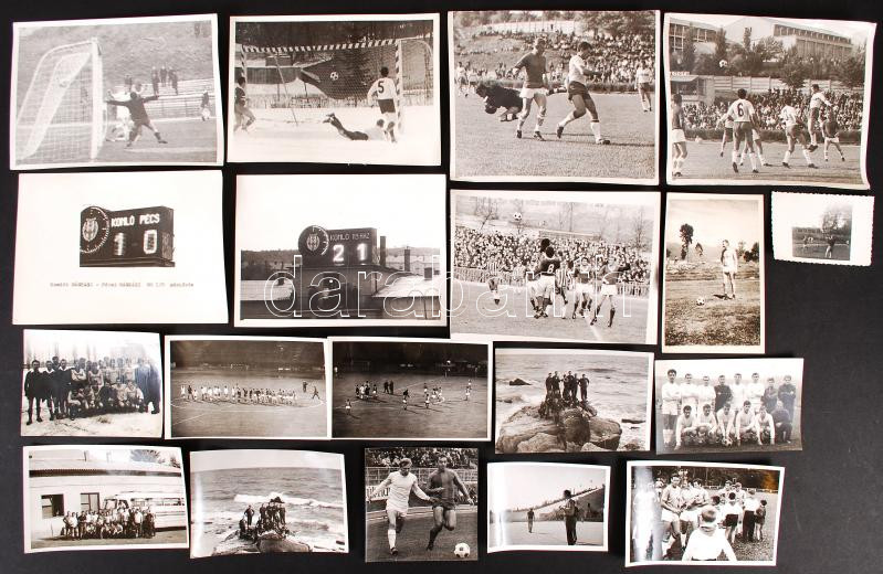 Beschreibung: cca 1960-1970 19 db labdarúgással kapcsolatos fotó, nagyrészt hazai csapatokról, Pl Komló, külföldi szereplések is