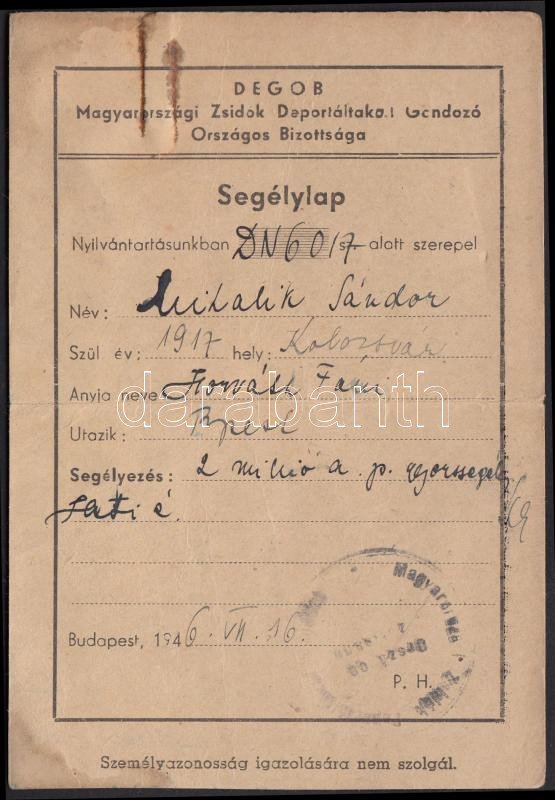 1946 DEGOB Magyarországi Zsidók Deportáltakat Gondozó Országos Bizotts... https://www.darabanth.com/de/211-Fernauktion/211.0/Andere-Sammelgebiete/Judaica~400326/1946-DEGOB-Magyarorszagi-Zsidok-Deportaltakat-Gondozo-Orszagos-Bizottsaga-altal-kiallitott-~II869363