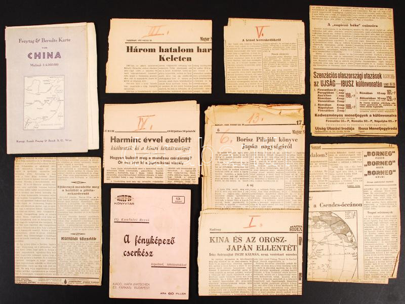 Beschreibung: cca 1930-1940 Kína térképe, Druck der Kartogr. Anstalt Freytag & Bernt, Bécs, 55x39 cm, valamint 8 egykorú újságkivágás
