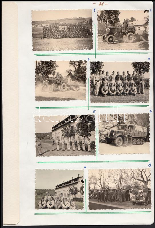 1941 Katona emlékek a II. világháború idejéből, a 21. oldal egy ismeretlen személy önéletrajzi vizuális naplójából képjegyzékkel, 8 db vintage fotó A4-es lapra felragasztva, 5x6 és 5x8 cm /