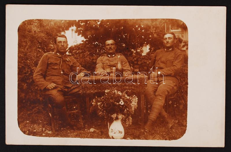 cca 1914-1918 Asztal mellett borozó katonák (K.u.k. Leichte Kraftwagenkol. No.66), fotóképeslap, 14x9 cm /